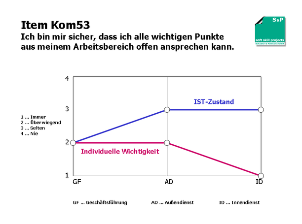 Die Fragebogenergebnisse zeigen, dass für die Geschäftsführung darin Übereinstimmung besteht, dass wichtige Punkte überwiegend offen angesprochen werden sollten und auch werden.